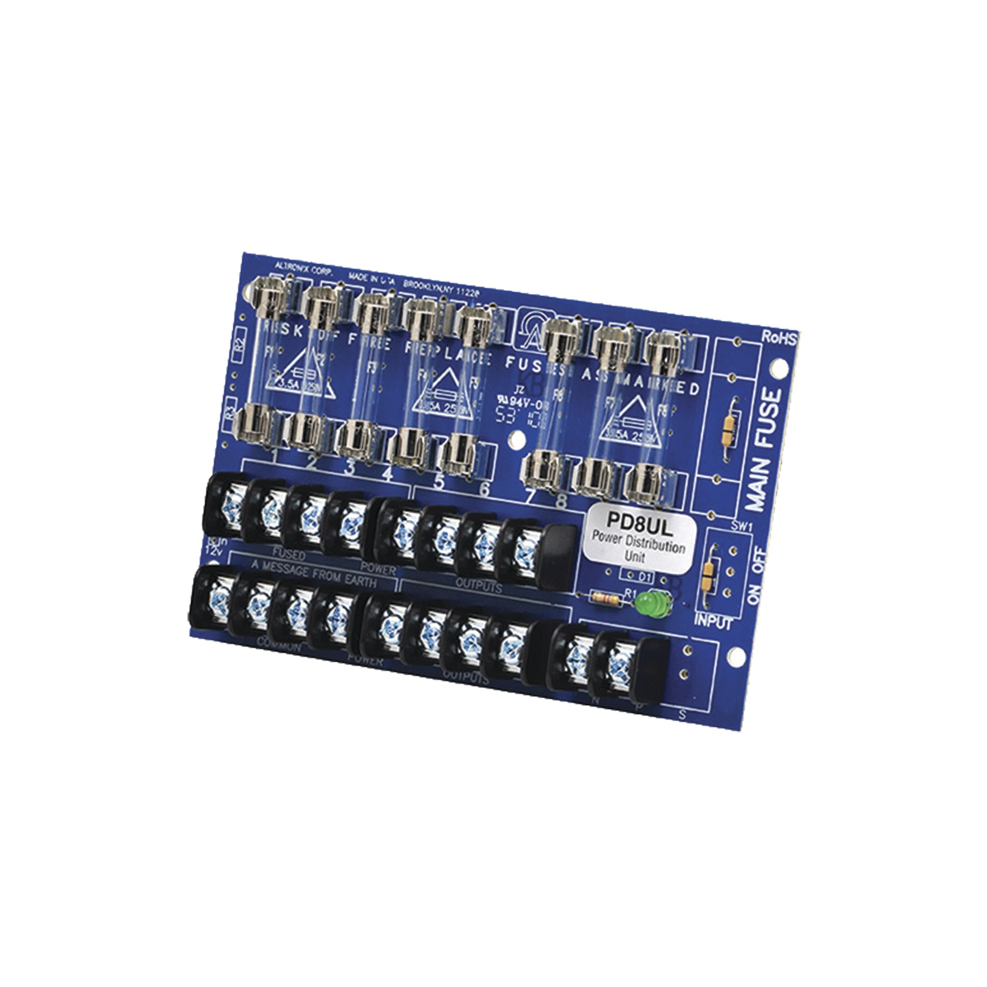 Tablero distribuidor de voltaje, 8 salidas con fusible de protección. Para uso con Fuentes de poder ALTRONIX.