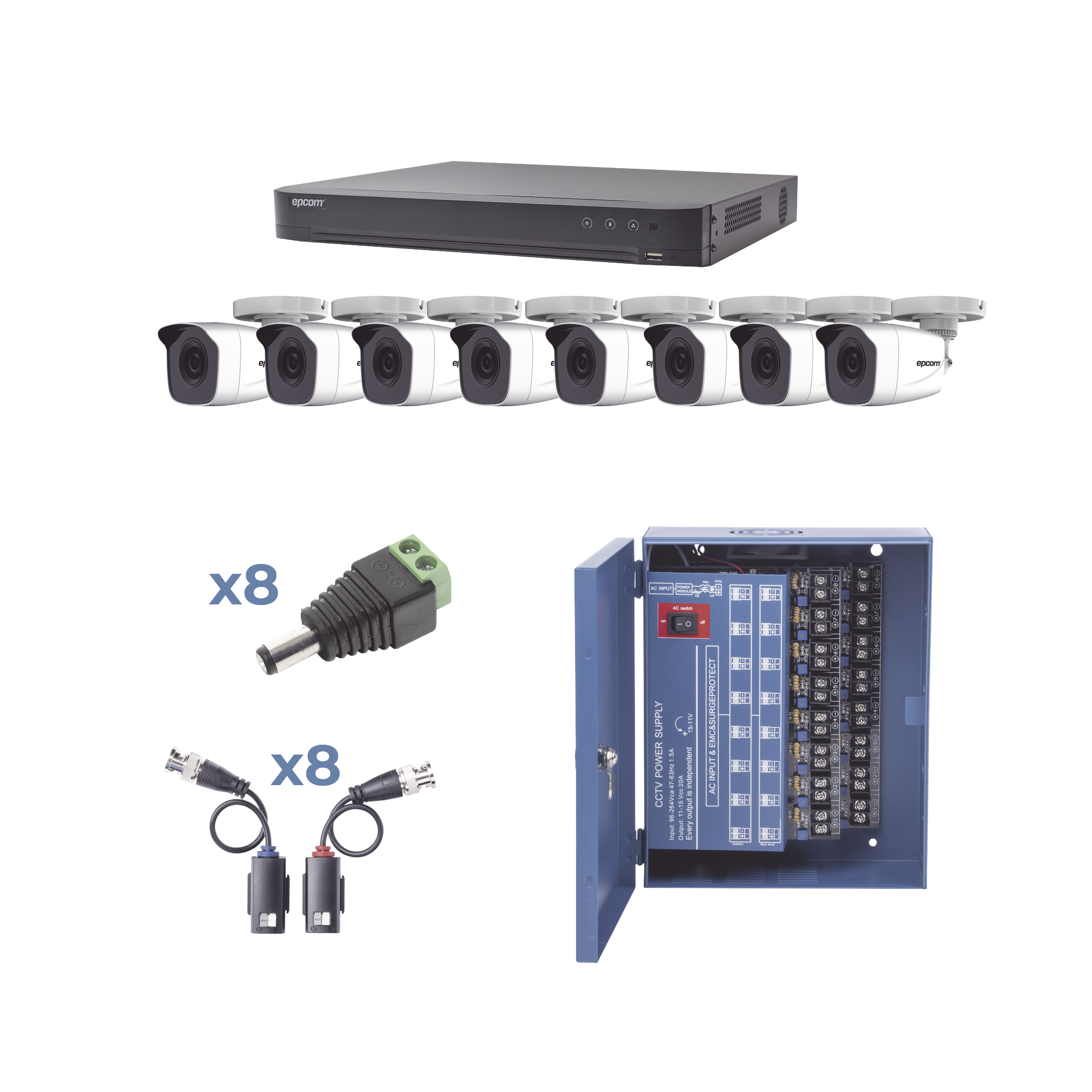 KIT TurboHD 1080p / DVR 8 Canales / 8 Cámaras Bala (exterior 2.8 mm) / Transceptores / Conectores / Fuente de Poder Profesional hasta 15 Vcc para Larga Distancias