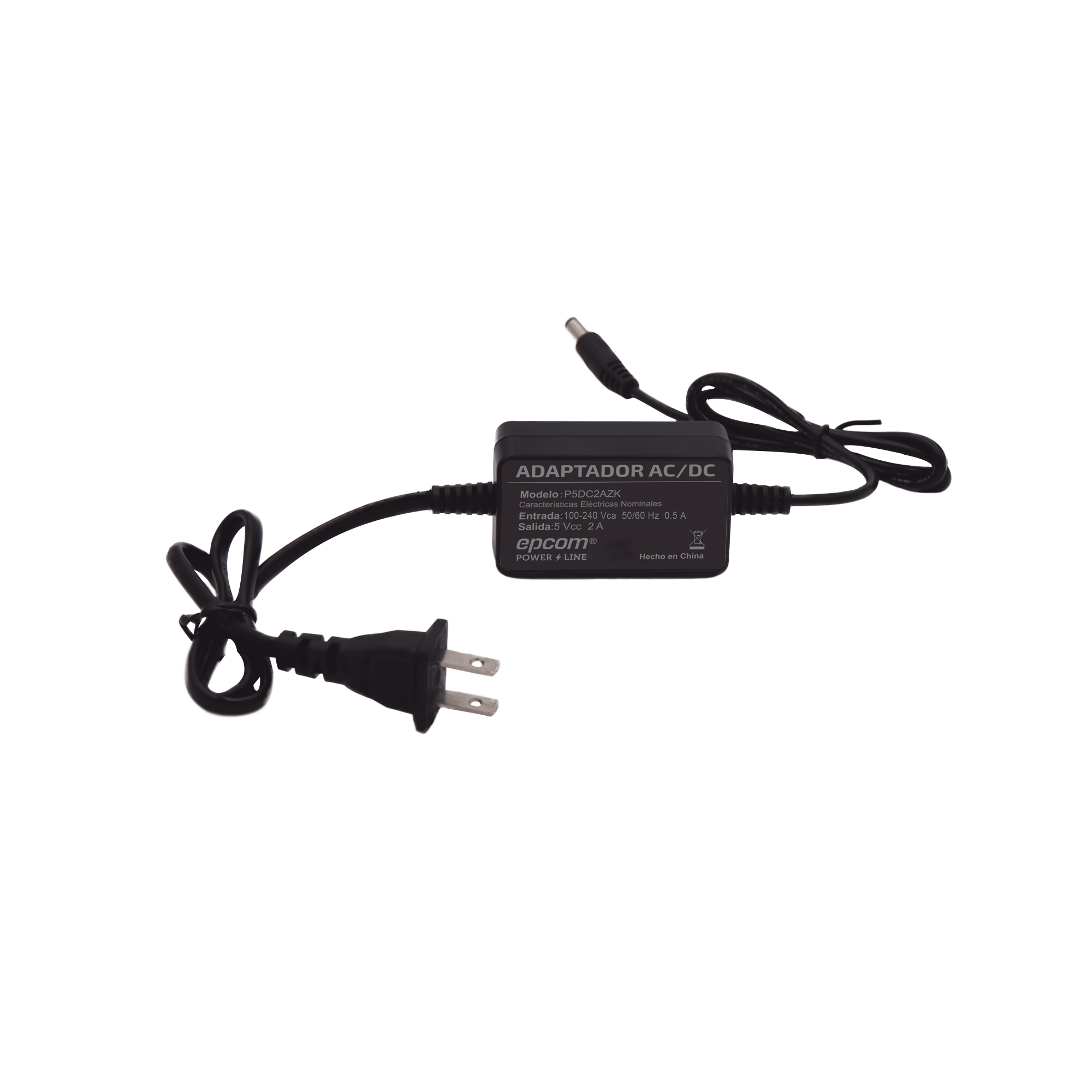 Fuente de poder de 5 Vcc regulado @ 2A; Voltaje de entrada de 100-240 Vca.