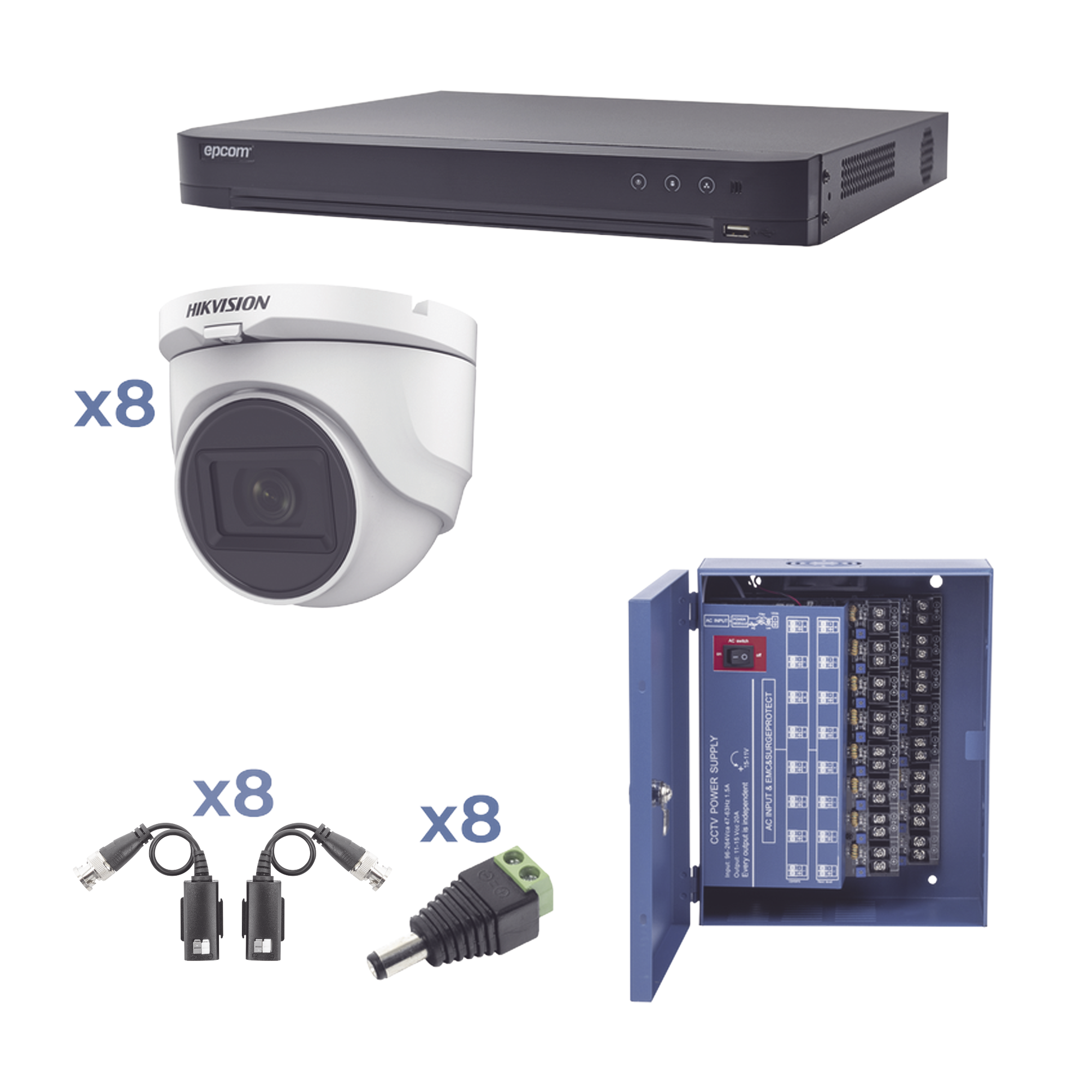 Kit TURBOHD 1080p / DVR 8 Canales / 8 Cámaras Turret (exterior 2.8 mm) / Conectores / Transceptores / Fuente de Poder Profesional hasta 15 Vcc para Larga Distancia