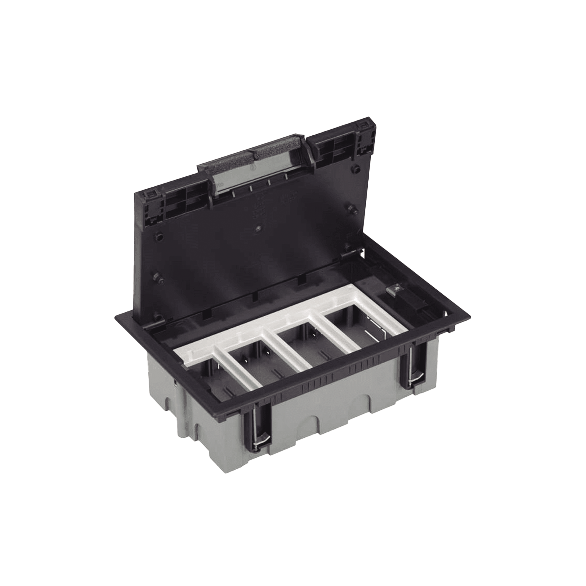 Caja Para Instalación en Pavimento para Voz, Datos o Contactos Eléctricos / Capacidad para 4 Módulos / Espacio Embellecedor en la Tapa / Profundidad Ajustable de 90 a 120 mm / Los Módulos se Adquieren Aparte / Incluye Registro